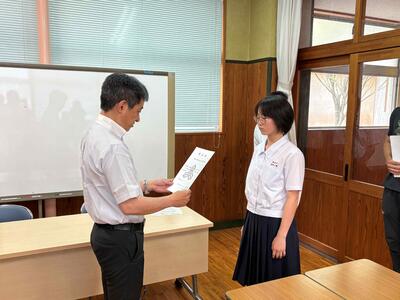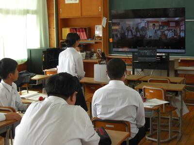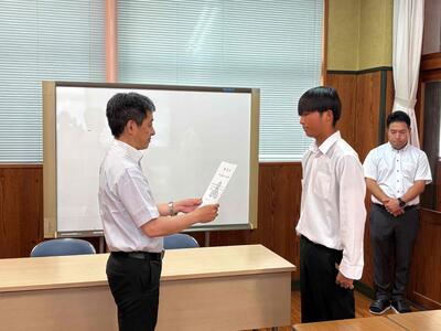 秋季地区中体連や県大会での優秀な成績や、読書感想文コンクールなど、様々な分野で活躍した生徒が表彰されました。画面越しではありましたが、教室は、「おめでとう!」の温かい言葉や拍手に包まれました。
