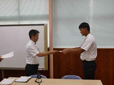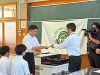 サッカー部の中村桜太さんが代表して、サッカーボールを受け取りました。今後は、部活動での練習や練習試合等で大切に使わせていただく予定です。