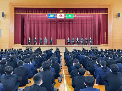 校長先生からは3学期の時の流れの早さについて話があり、生徒全員が3学期の終わりには成長を感じられるようになってほしいとお話がありました。また、成長を感じるためにも令和5年で何をするか文字に表してほしいとお話がありました。最後に各学年に向けて、1年生には、後輩が入ってくることを意識して魅力ある先輩とした姿、2年生は後輩の良き手本として互いに注意し、頑張れる姿、3年生は進路に向けて取り組んでほしいといった話がありました。