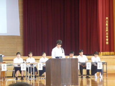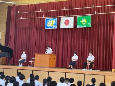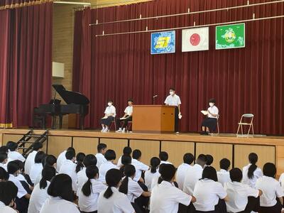 生徒を代表して、1年 池田雷汰さん・2年 松岡咲里さん・3年 髙浜明さん・生徒会代表 黒木陽歌里さんが「1学期を振り返って」の作文を読んでくれました。
