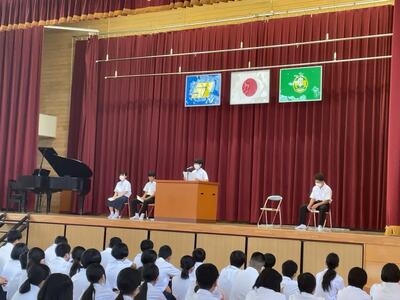 その後の全校集会では、学習面・生活面・健康面について各担当の先生からお話があり、6月に行われた地区中学校総合体育大会の成績紹介も行いました。