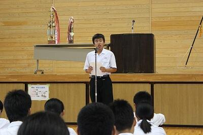 最後に、4月から10月14日(金)まで、主に3年生を中心として英語の指導をしてくださった學頭一彌先生があいさつしました。學頭先生お世話になりました。体育大会の姿が印象的で、生徒の姿に感動したということでした。これからの門中生にエールを送っていただきました。