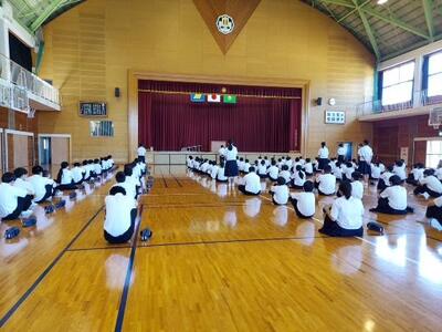 集会では、学習面では、授業の受け方や提出物の徹底についての話、生活面では、「時を守り、場を清め、礼を正す」ことの話がありました。