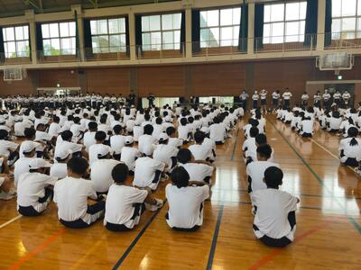 10月10日に、寄贈式を行いました。この式は、本校の学校医を40年間つとめていただいた田中病院の田中浩夫会長から総額約1000万円の体育用品等を寄贈していただいたことに伴う式です。式には、田中病院の椿原事務長に来校していただき田中会長のあいさつを代読していただきました。あいさつでは、本校生徒の「健全育成」・「体力向上」を願って寄贈していただいたことを話をされました。サッカーゴールやバレーボールのネット、折りたたみ式のテントなど寄贈されたものには「田中病院寄贈」のシールが貼られています。大切に使用していきたいと思います。