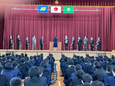 校長先生からは3学期の時の流れの早さについて話があり、生徒全員が3学期の終わりには成長を感じられるようになってほしいとお話がありました。また、成長を感じるためにも令和5年で何をするか文字に表してほしいとお話がありました。最後に各学年に向けて、1年生には、後輩が入ってくることを意識して魅力ある先輩とした姿、2年生は後輩の良き手本として互いに注意し、頑張れる姿、3年生は進路に向けて取り組んでほしいといった話がありました。
