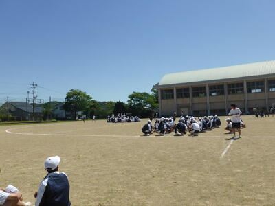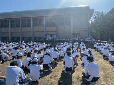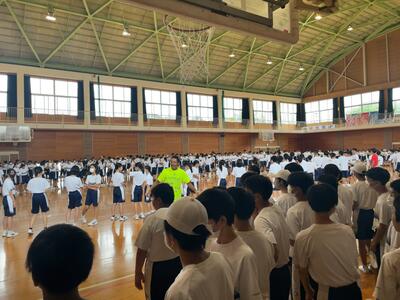 その後の全校集会では、学習面・生活面・健康面について各担当の先生からお話があり、6月に行われた地区中学校総合体育大会の成績紹介も行いました。