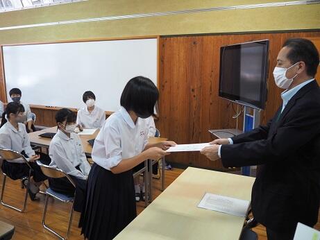 今回、生徒からSPS活動のサポーターを募集したところ、19名の応募がありました。交付式では、SPS協議会本部より送られた委嘱状を一人づつ校長先生から渡され、激励を受けました。