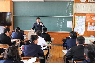 門川中学校の山之口主幹教諭が、「戦争とは」、「平和とは」と問いかけながら、一枚の写真を素材として、生徒に考えさせました。