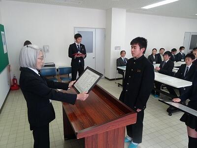 表彰を受ける様子とお礼の言葉を述べる前生徒会長