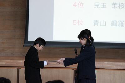 12月16日(金)の朝の活動時間に読書集会を実施しました。図書委員の生徒たちが準備し進行・発表しました。その中で多読賞の表彰もありました。1位は1-2、2位は1-2、3位は1-4と1年生が独占しました。次に4位2-5、5位2-3という結果でした。3年生になると受験勉強で読書する人が減るようです。