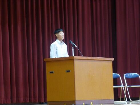 はじめに、旧役員の挨拶と感謝状の授与、三役の挨拶の後、新役員を代表して、生徒会長の大田君の力強い挨拶が行われました。他の生徒は会の模様を各教室のモニターから観覧しました。
