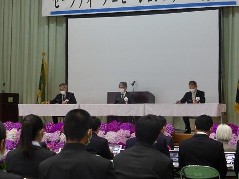 本校と並んで認証された門川高校体育館で式典が行われ、校長先生が調印式に臨まれ、本校生徒会が生徒を代表して、これまでの取組を紹介しました。今後、防災だけではなく幅広い分野における対策に取り組み、安全安心な学校を目指していきます。