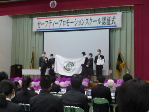 3月19日(金)に、門川高校でSPS認証式が開催され、本校は正式にSPS(セーフティプロモーションスクール)に認証されました。SPSとは、学校独自の安全推進を目的として、その目標と計画を達成するために組織の整備と実践と協働が継続されていると認定されている学校で、九州では初めての認証となりました。
