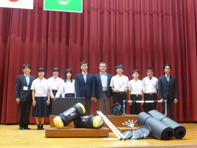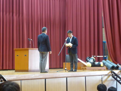 10月10日に、寄贈式を行いました。この式は、本校の学校医を40年間つとめていただいた田中病院の田中浩夫会長から総額約1000万円の体育用品等を寄贈していただいたことに伴う式です。式には、田中病院の椿原事務長に来校していただき田中会長のあいさつを代読していただきました。あいさつでは、本校生徒の「健全育成」・「体力向上」を願って寄贈していただいたことを話をされました。サッカーゴールやバレーボールのネット、折りたたみ式のテントなど寄贈されたものには「田中病院寄贈」のシールが貼られています。大切に使用していきたいと思います。