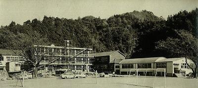昭和47年度の卒業アルバムに載っていた写真です。木造校舎の一部を取り壊し、現在も使っている校舎の建築中です。前年度(昭和46年度)の写真と比べると、中央より右側の技術室などの等の右側が増築されています。この増築された部分は、現在級祝受け入れ室と倉庫として使っている建物と似ています(現在、西門川小学校の校舎と体育館の間にある建物です)。