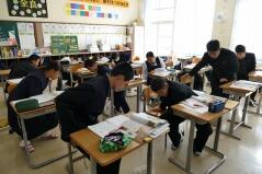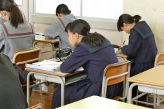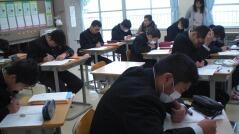 この時間は2時間目です。それぞれの学級で2学期最後の授業が行われています。この後、3時間目が終業式、4時間目が学級活動です。給食を挟み、5時間目に大清掃を行って生徒は下校します。
