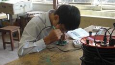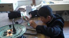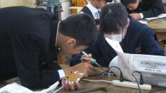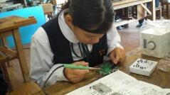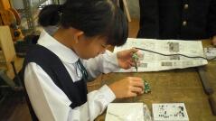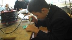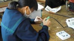 2年生の技術・家庭科(技術分野)ではエネルギーや電気に関する勉強をしています。製作の時間は、電子部品などをはんだ付けして、手回し発電機を備えたラジオを作っています。ほとんどの生徒がはんだ付けをしたことがなく、はんだと針金の区別もつきません。はんだ付けは今日が3時間目だったので、手際よく作業を進める姿も見られるようになりました。