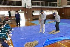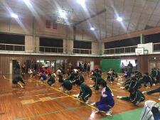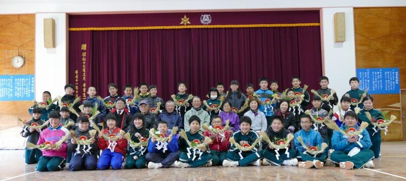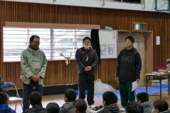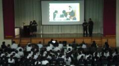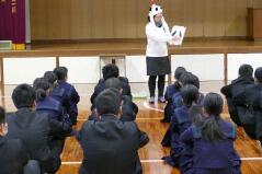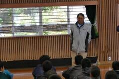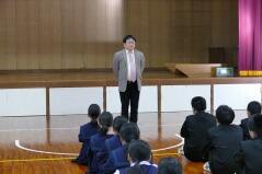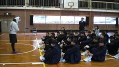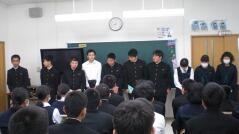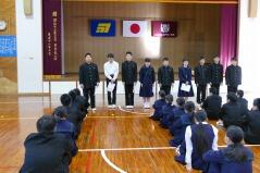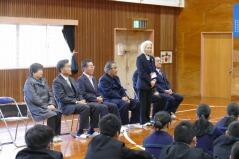 スクールバスで大王谷中学校に行き、体育館での全校集会から参加し、全校生徒に迎えていただきました。
