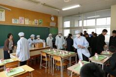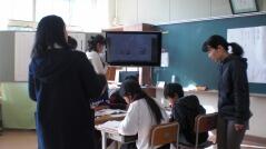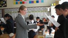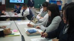 いつもの授業と違い、十数名の先生に見られながらの授業で緊張していましたが、子どもたちは英語での道案内に奮闘していました。授業の終わりには、学習した内容の振り返りとして、10月に3学年で実施した実力テストの問題を解いたところ、8割の生徒が正答していました。