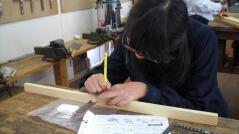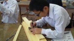 1年生の技術・家庭科(技術分野)の授業は、「材料と加工に関する技術」を勉強しています。1学期は物作りの視点や材料の特性など「座学」が中心でしたが、11月に入ってからは材料や道具を手にしながら、実際の製作に入りました。今日の授業は「けがき」で、自分が製作する棚や本立ての材料取りのために、寸法を測り、鉛筆で必要な線を引きました。