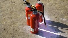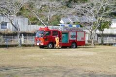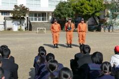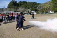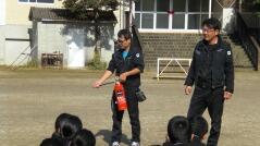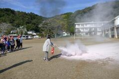 避難後は、日向市消防本部の方からの講話や日建防災様による消火器の使い方の説明をしていただきました。講話では、「お・か・し・も」の説明があり、子どもたちに避難の際に気をつけることを話してくださいました(押さない・駆けない・しゃべらない・戻らない)。また、消火器とポンプ車からの放水体験をさせていただきました。