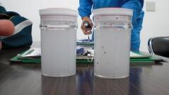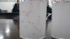 実験では、セオラスを加えた液体で、物質が均一に広がり、沈んでこないようすを観察したり、錠剤の外側をセオラスで覆うと、水に溶ける時間が変化するようすを観察したりしました。
