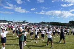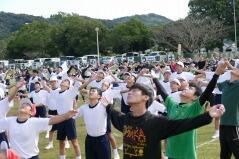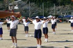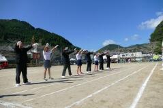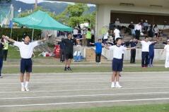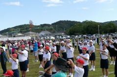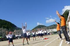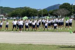 児童生徒の入場行進に引き続き、開会式を行い、「運動会の歌」や「若い力」を歌いました。また準備運動では、児童生徒と職員、そして来賓や保護者の皆様と一緒にラジオ体操をしました。