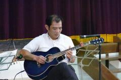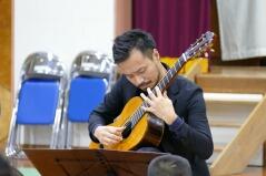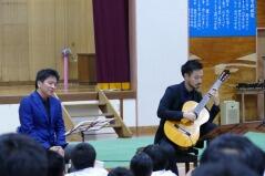 自然風景をイメージした構成になっていて、「燃える秋」や「この道」、「叱られて」などの曲を、演奏してくださり、のびのある美しい歌声と、ギターの心地よくリズム感のある音が体育館に響いていました。