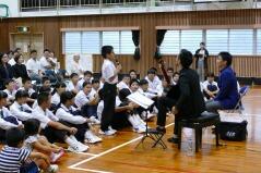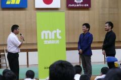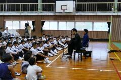 今日の午後、mrtの主催により、体育館で「ココから音楽大作戦キャラバンコンサート」が開催されました。出演してくださったのは、カウンターテナーの藤木大地さん(宮崎市出身)、ギタリストの大萩康司さん(小林市出身)で、コンサートはお二人を子どもたちが扇形に囲むように行われ、プロの演奏や歌声を目の前で聴くことができました。