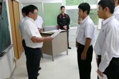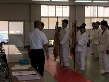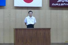 県中学校秋季体育大会が先週末から開催されています。西門川中からは、柔道競技の団体戦(11月4日)と個人戦(11月5日)、陸上競技2年男子1500m(11月5日)に出場します。今朝はその推戴式を行い、選手は大会出場にあたっての抱負を一人ずつ発表しました。