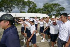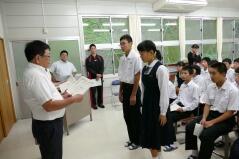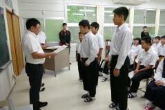 推戴式では、代表選手が試合に向けて意気込みや抱負を発表し、生徒会長と校長先生が激励のことばをかけました。台風が日本の南海上にあり、予定どおりの開催ができるか心配ですが、これまでの練習の成果を発揮し、学校の代表として悔いのない試合をすることを期待しています。