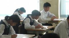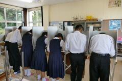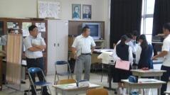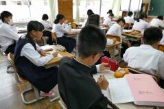 全校集会の後の1校時は授業でした。1年生の教室では数学で、子どもたちが苦手に感じている「比の計算」が行われていて、書画カメラを使いながらの説明を聞いていました。2年生の教室では中間テスト対策の英語の授業、3年生の教室では実力テストが行われていました。