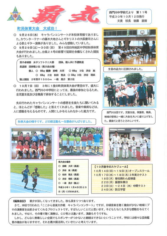 10月も今日で終わり、明日から11月です。町民体育大会や学習・文化発表会などがあり、今月の前半は子どもたちも忙しかったと思います。後半は実力テストや中間点ストもあり、落ち着いて勉強に取り組いました。
