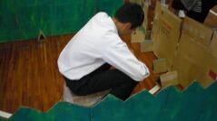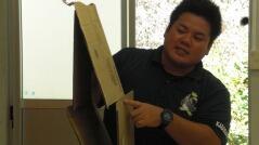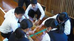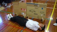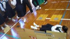その後は、段ボールを使った簡易トイレや、間仕切りの使い方を説明し、体育館で実際に作り体験しました。