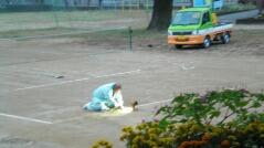 今朝6時20分頃出勤するとテニスコートに1台の車と作業する人の姿がありました。先月の台風で浸水し、テニスコートの表面には泥が堆積していました。昨日の午後、業者の方が重機を使い整備してくださいました。
