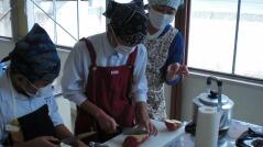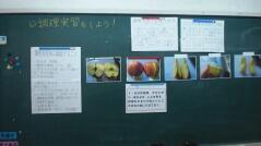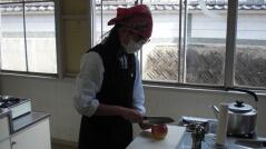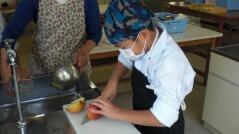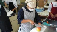 上手に包丁を使う生徒がいる中で、はじめてのような手つきで包丁を使っている生徒もいました。下の大きさと比べると小さくなったリンゴや、山切りになってしまったリンゴもありましたが、誰一人けがをすることなく授業を終えました。