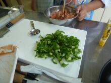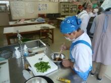 5・6校時に、1年生の調理実習(家庭科)が行われました。メニューは「豚肉のしょうが焼き」と「ほうれん草のおひたし」。グループごとに別れて、計画に従って、