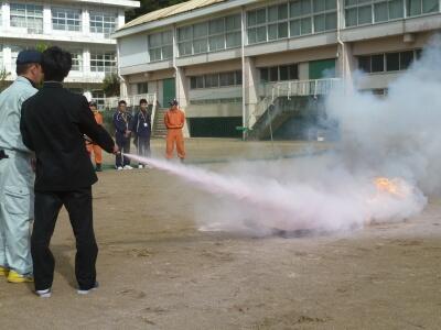 その後、消火器の使い方や代表児童生徒による実習もありました。最後に放水体験もしていただき、充実した避難訓練でした。