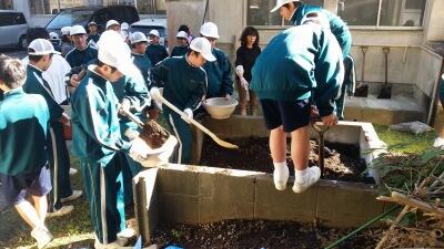 5校時に第4回花壇学習を行いました。花の苗植え。全員でプランターや鉢に土を入れ、苗を植えます。その後、学年の花壇、正門前花壇、郵便局前に別れて各場所に植えました。