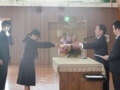 今朝の全校集会では、先日行われた生徒会役員選挙によって選出された、新生徒会役員の任命式を行いました。一人一人に任命証を手渡しました。