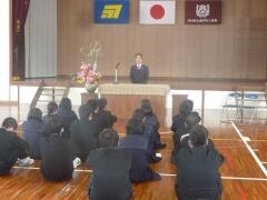 転出される先生方4名とのお別れの日。職員室で職員とのお別れの会を行った後、体育館で子どもたちとのお別れの式を行いました。先日卒業した卒業生を含め殆どの生徒が参加しました。また、保護者や地域の方も参加され、涙の離任式でした。