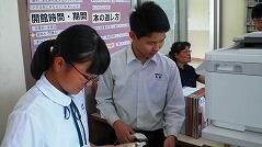 今日は「ノーメディアデー」です。子どもたちはテレビやゲームなどのメディアから離れ、「家庭で読書」をする日としています。このため、昼休みは学校図書館の本を全員が借りる日です。子どもたちは給食後、借りる本を選び、係の生徒がパソコンを使って貸し出しの処理をしていました。