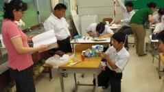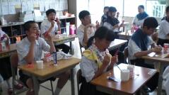 2年生の技術・家庭科(家庭分野)では、「家族・家庭と子どもの成長」という単元を学習しています。今日は身近にある牛乳パックやCDなどを使い、幼児と遊ぶためのおもちゃづくりをしていました。子どもたちは材料や形、組み立て方などをそれぞれ工夫して作っていました。このおもちゃは、夏休みに実際に幼児と遊び使うことになるそうです(一緒に遊ぶことが夏休みの宿題でしょうか?)。