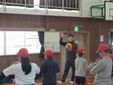 2校時に交流授業。保健体育担当の甲斐先生が、小学5・6年生の体育の