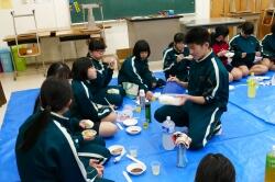 5・6校時に、2年生は家庭科で調理実習を行いました。メニューは、「しょうが焼き」。班で
