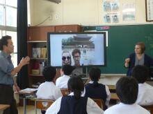 授業者は、英語科担当の眞方先生、1年生の英語の授業です。学習のめあてに沿って、子どもたちは楽しそうに、そして、集中して学習に取り組んでいます。