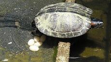 カメは2匹いて、そのうちの1匹が今日のお昼頃、9個の卵を産んでいました。池で飼っているカメはミドリガメだと思いますが、産卵しているようすは初めて見ました。感動しました。