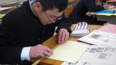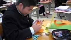 3年生の美術の授業では「立体的なメッセージカード」を作っています。カードを開くとメッセージや飾りが出てくるように画用紙にカッターで切り込みを入れて、折り方を工夫しています。また、画用紙の色を工夫しています。卒業までおよそ2ケ月となった3年生が、感謝の気持ちを伝えているものもありました。