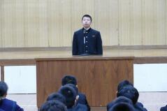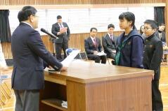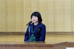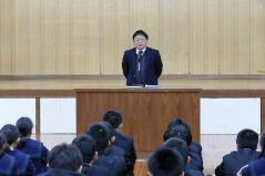 代表生徒の「3学期の抱負」では、1,2年生からは「学習内容がわかるまで勉強する」「実力テストに向けて復習する」「期限までに提出物を出す」「学級委員長としてクラスをまとめる」「部活動で一球一球気持ちを込めて打つ」など、努力することを具体的に挙げながら発表しました。3年生は「入試」「卒業式」「義務教育最後」など、受験生、そして最高学年らしい抱負を発表していました。