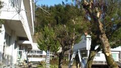 雨のため昨日できなかった庭木の剪定を今日していただいています。午前中は残っていた校舎南側の樹木の剪定をしていただきました。午後からは、技術室南側にある松の木が電線にあたっているので、伐採していただきます。作業はシルバー人材センターの方々がしてくださっています。はしごとチェーンソーを使いながら手際よく作業をされていました。”プロ”の作業に感心するばかりでした。